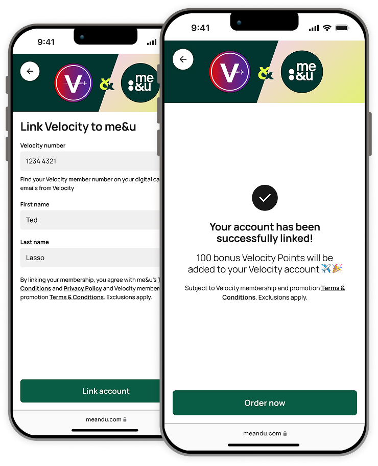 ^Velocity and me&u 100 Bonus Velocity Points Linking Offer Terms & Conditions ^From 12.00pm AEDT on 24 November 2025 (unless extended, varied or removed by me&u or Velocity), Velocity Frequent Flyer members (“Velocity Member”) who have a registered customer account with me&u can earn 100 bonus Velocity Points if they link their Velocity and me&u accounts by entering their first name, last name and valid Velocity membership number in the homepage of the me&u digital menu or in the settings section of the me&u app. Velocity Members can link their account either in a Participating Venue when scanning a QR code or out of the Participating Venue in the linking form.